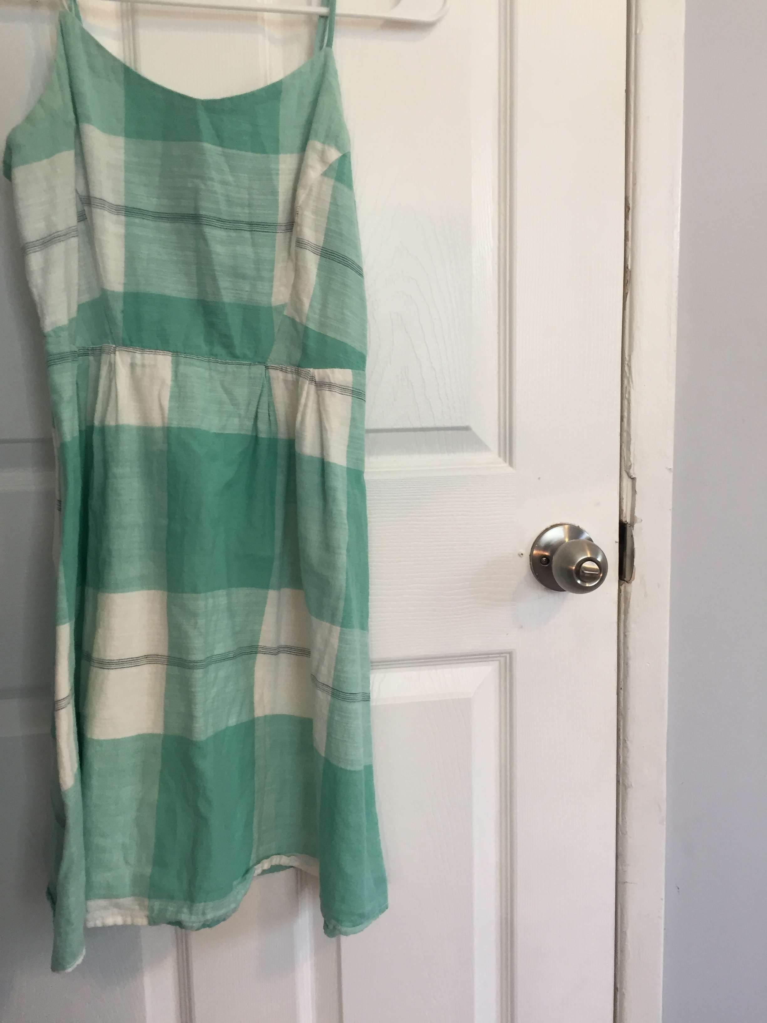 Plaid Spaghetti Strap Dress in Pastel Green. Green and white plaid checkers. Slight V neckline. Comes in under bust and flares out at bottom a bit. Great condition.