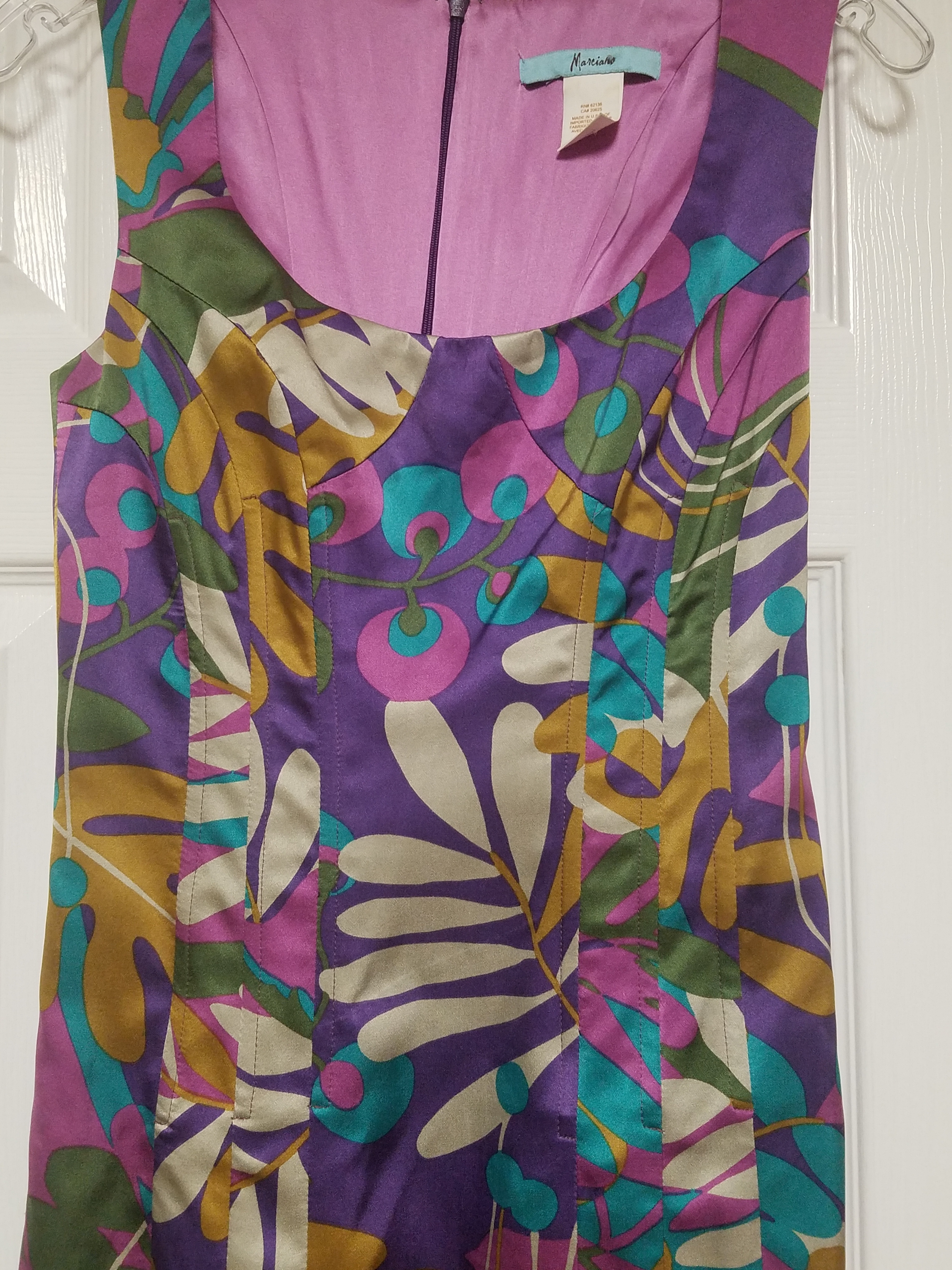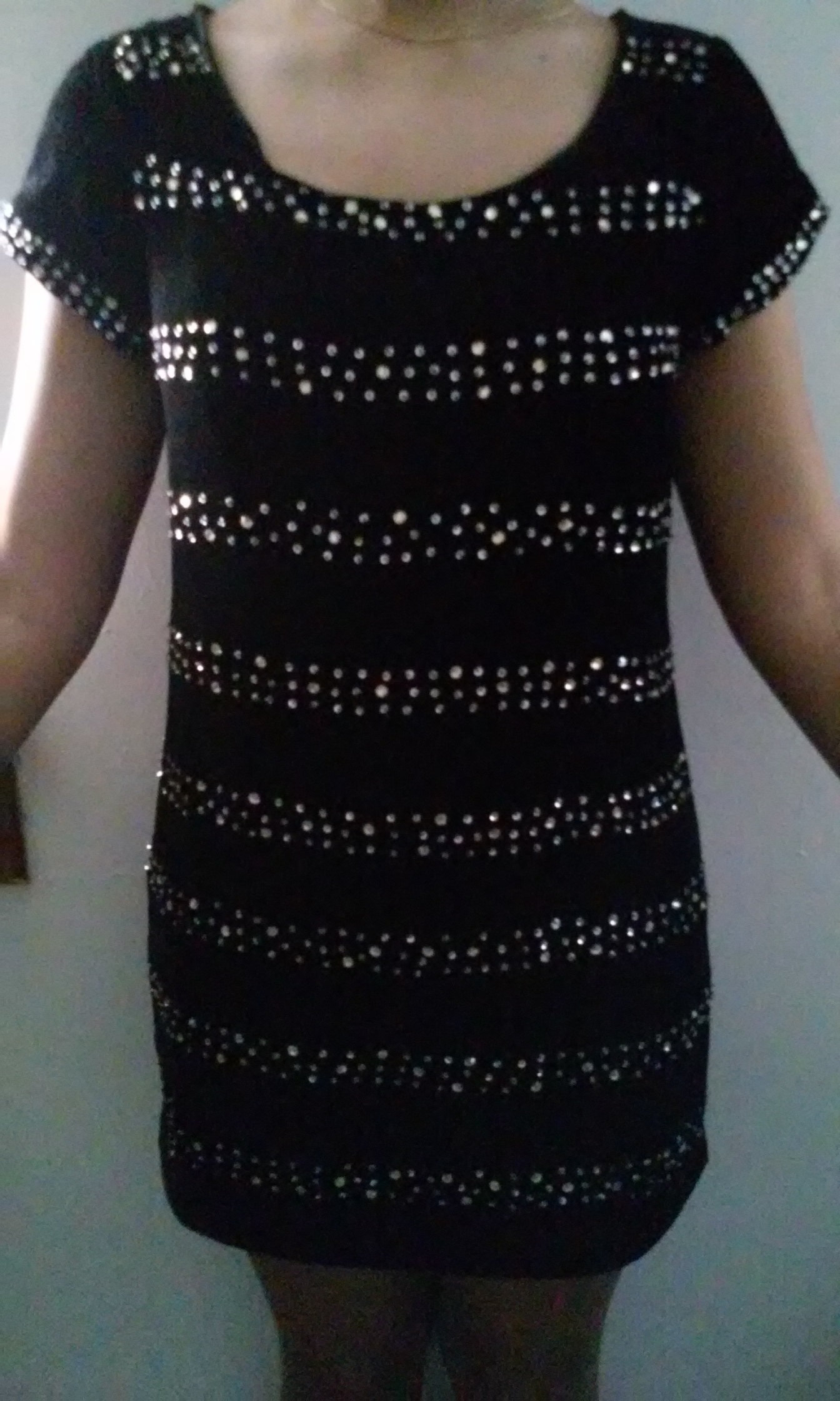 Inner side of dress is lined with 100% polyester, outer is 80% rayon 20% silk Sequence is sewn on creating horizontal stripe pattern against the black velvet. May have been worn once, I don't recall, practically new.