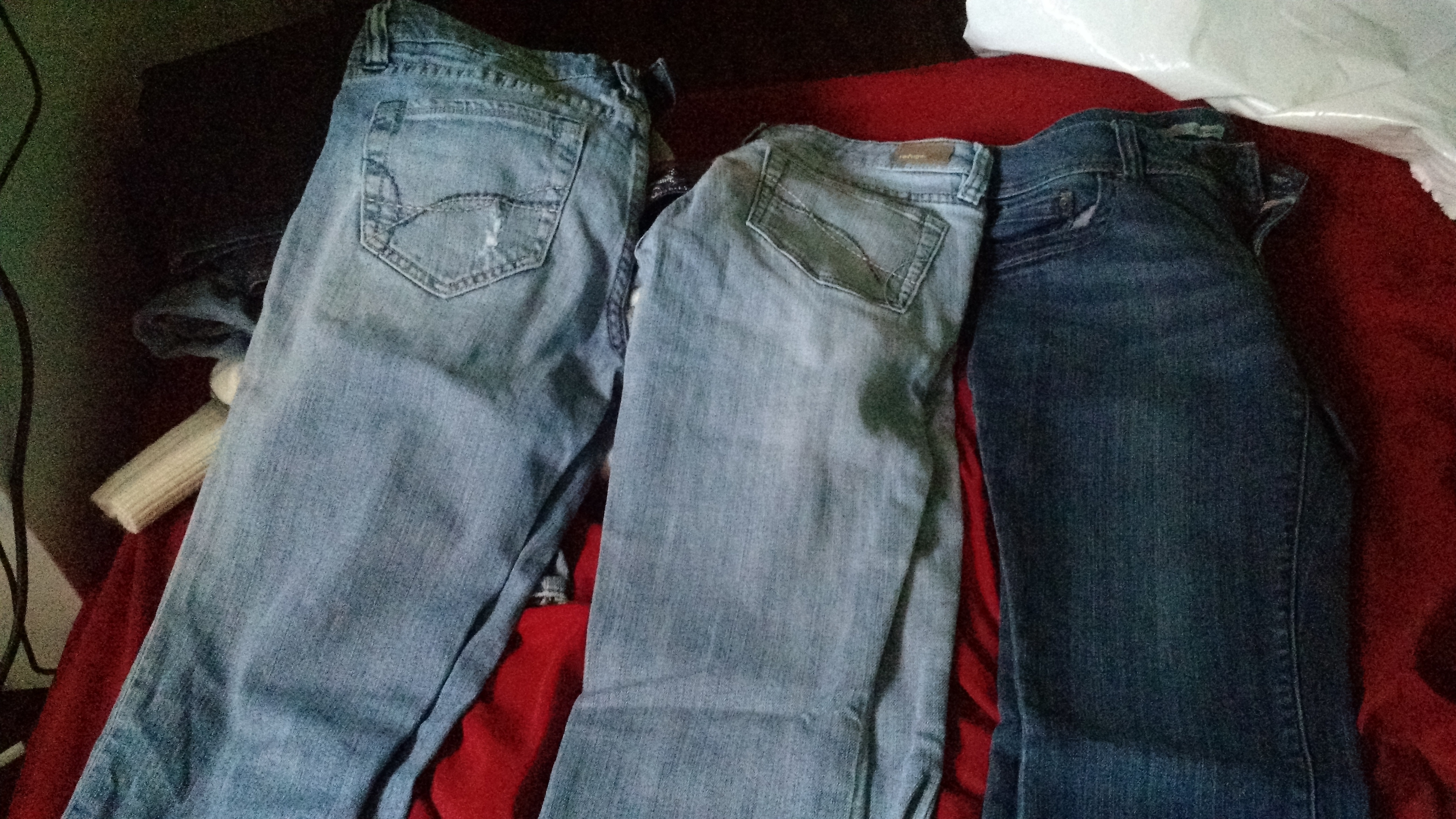 3 blue skinny denims, 1 denim and white top, 2 colourful floral skirts, grey dress with long slips, red paisley scarf, green three quarter linen pants with string. size 10 - 12