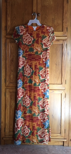 Long slenderizing designer dress by Vivian Tam. Size 3
