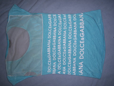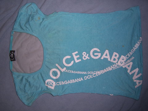 Here's an authentic tee top by: DOLCE GABANA. Size SMALL, very sexy on with lacey see-through on half of back. (The actual top looks way better than photo, it looks very good on, but photo just doesn't look that good) The neck is also wider than what the photo makes it look. Fabric is very soft, stretchable, and so comfy on. I got this shirt, worn it 4-5 times in 2008 summer, and forgot all about it until I check one of my donation box. Overall, great condition. (However, this top need to be wash, I saw some tiny stains on top that looks like will come off if you wash it) There are very light almost unnoticeable piling on top. I will be picky on this top, since it doesn't have to go, and I can still give it away to family/friends since I did paid a lot of money for it.