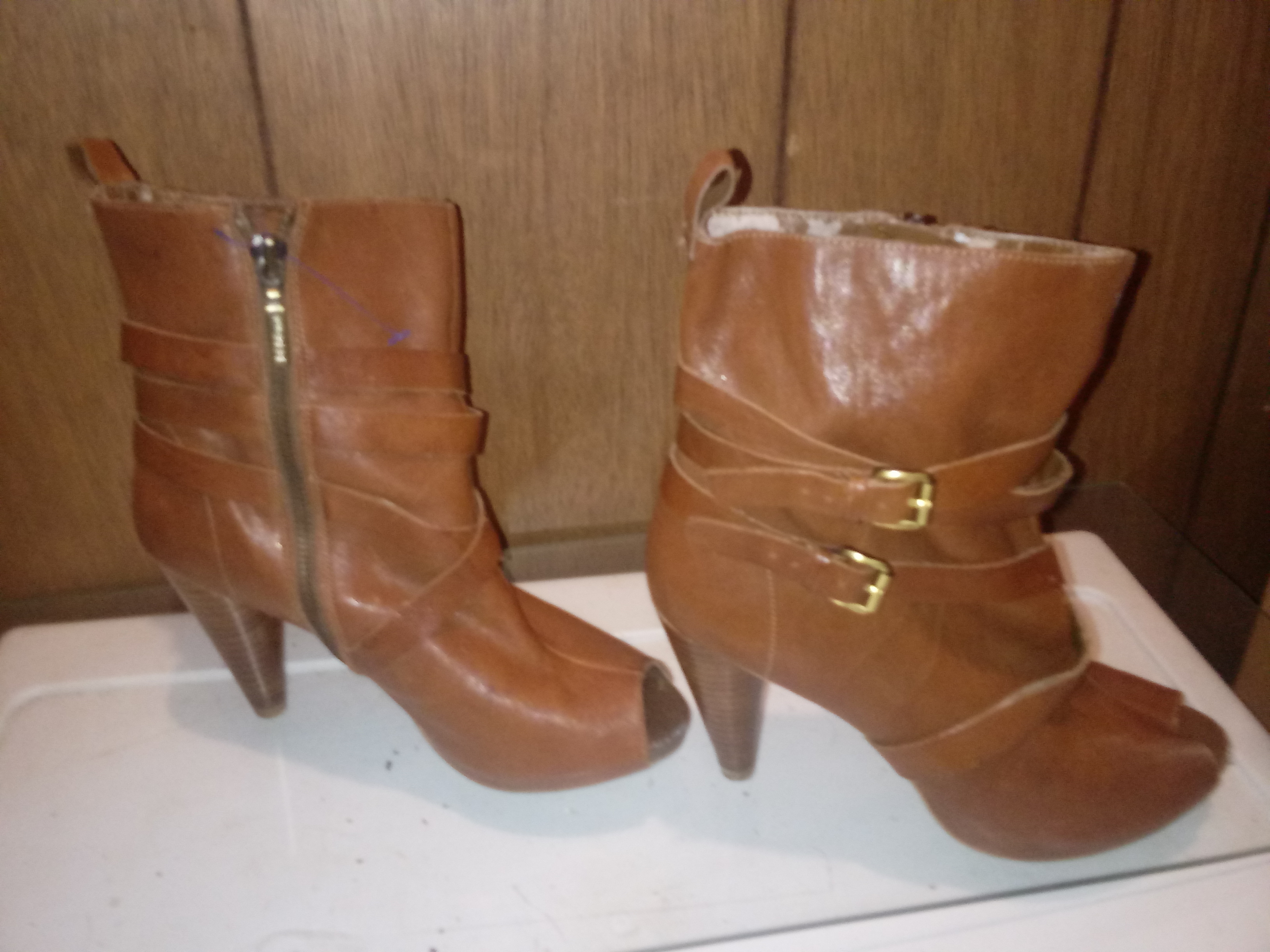 Fairly used brown boots, comfortable but a little slippery