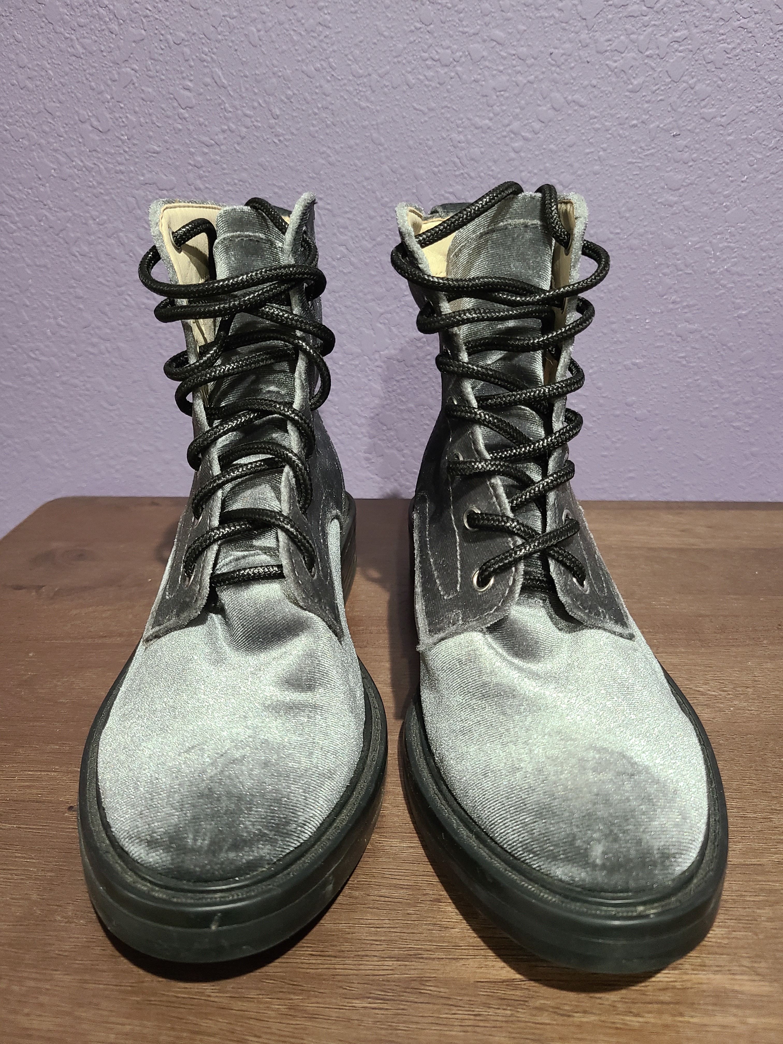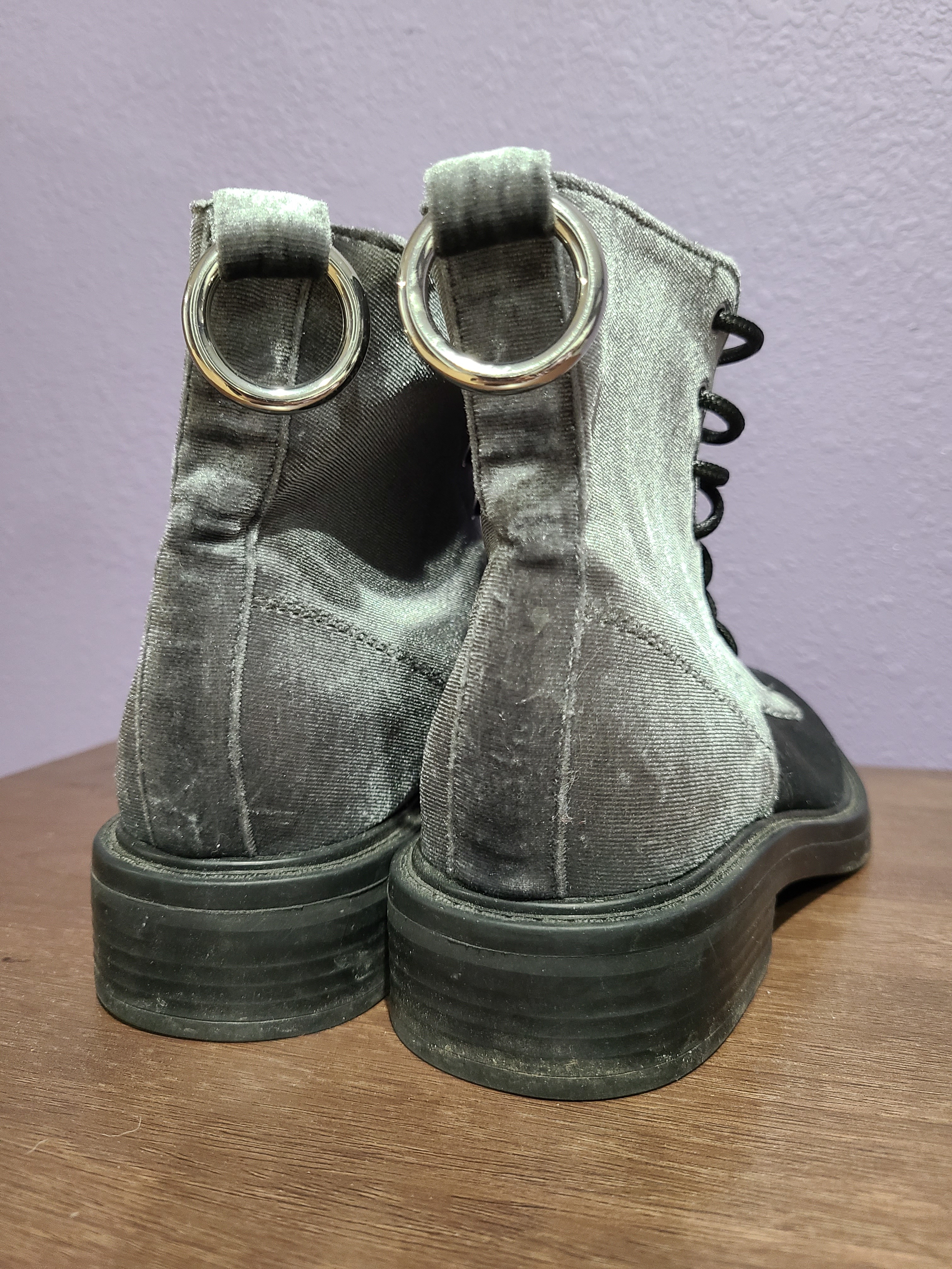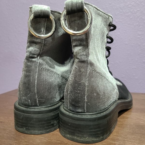 Worn one time. Still look new. Grey velvet boots with heavy O ring on ankle.