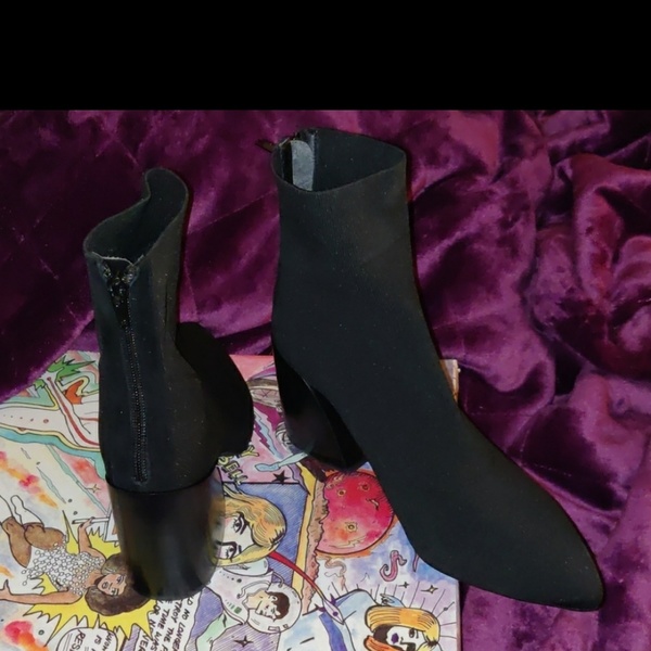 Bentlee Bootie in Black Stretch knit upper with man made sole Leather lining Back zipper closure with suede trim Curved heel Heel measures approx 3" H Shaft measures approx 4.5" H These are brand new never worn I paid $175 for them.