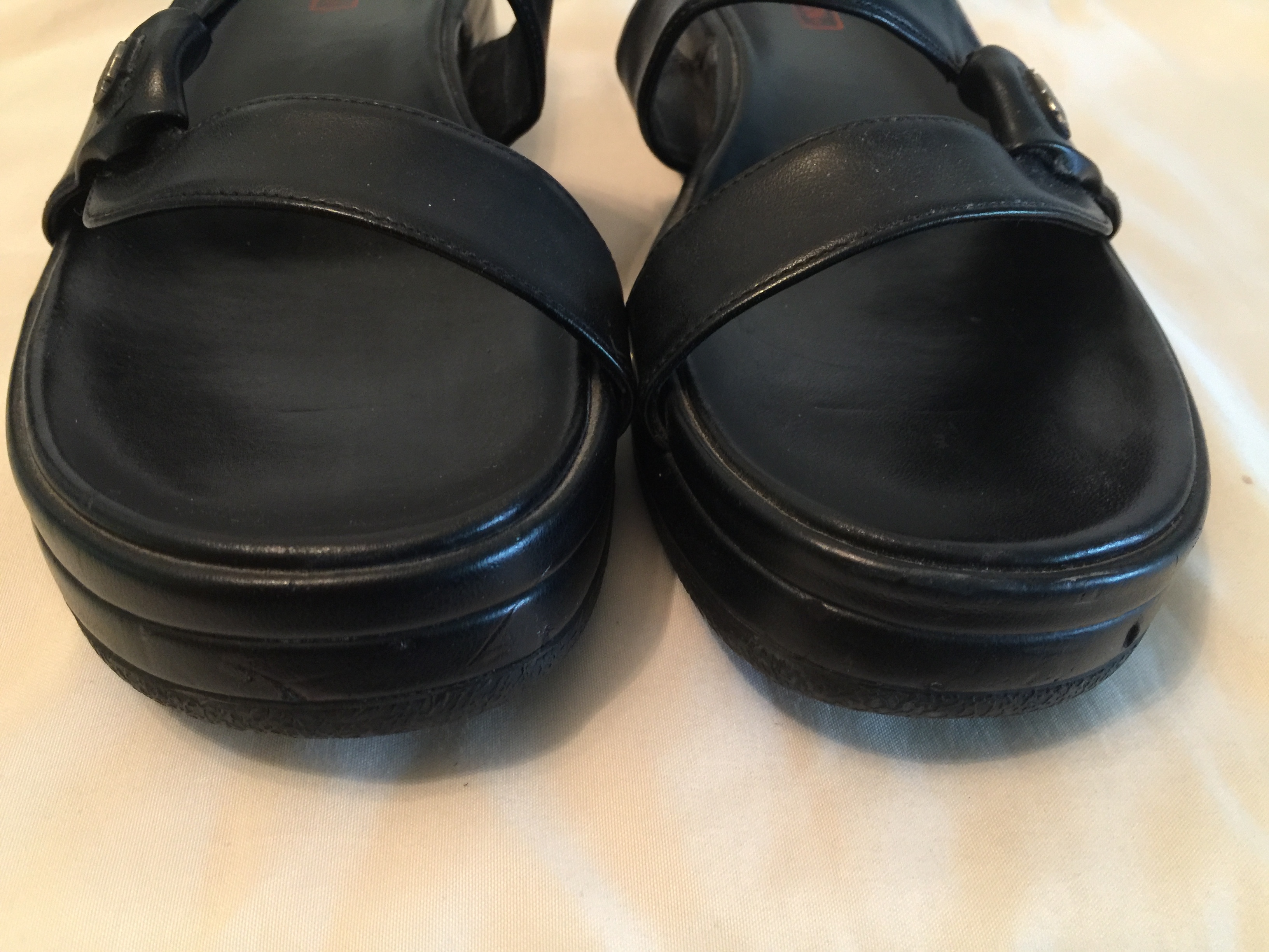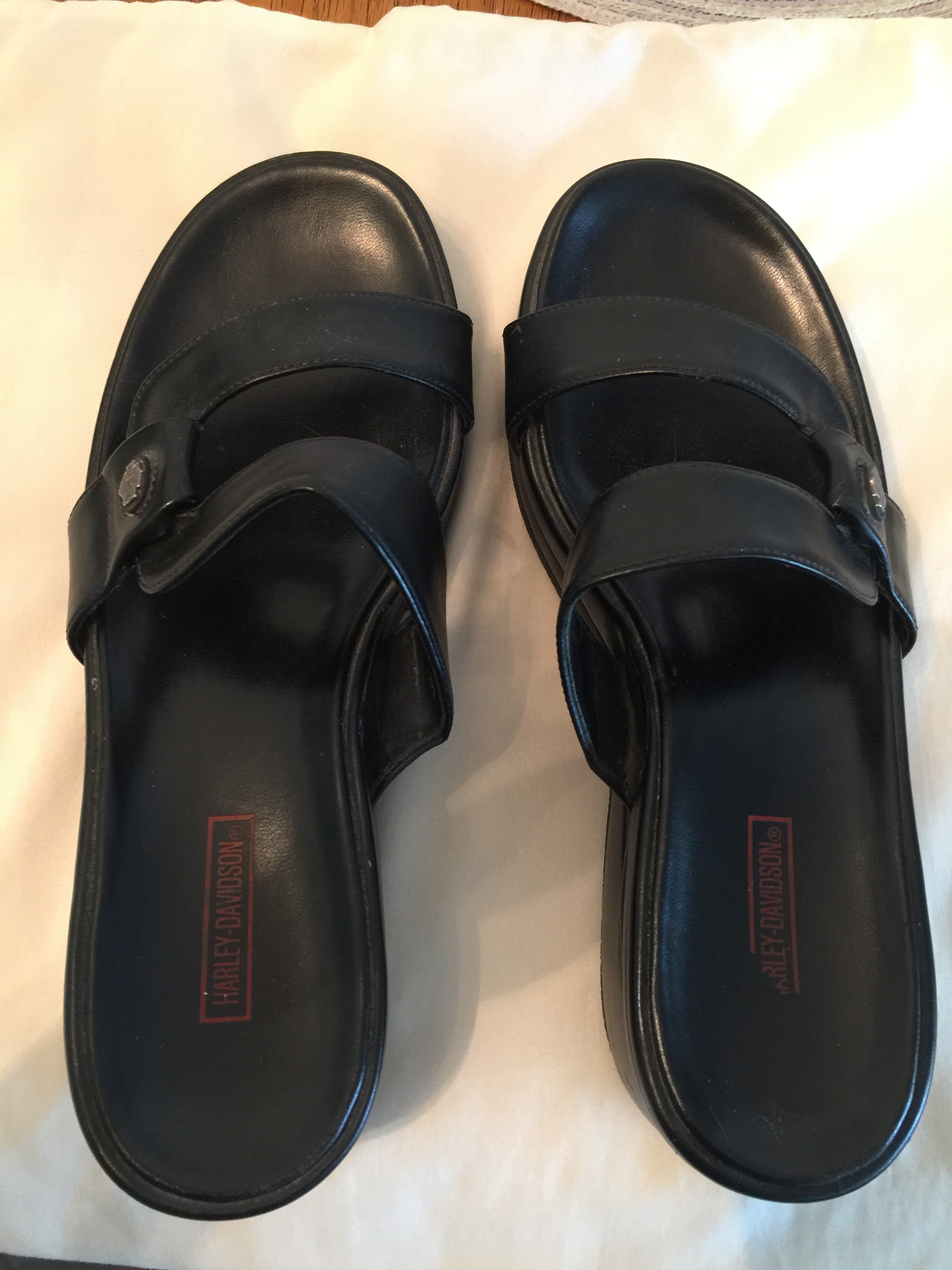 These are true to size 8M comfortable and stylish Harley Davidson sandals. They have 2 scuff marks on left shoe and 3 on the right shoe, covered by shoe polish, but otherwise are in good condition. The scuffs can be seen in the photos.