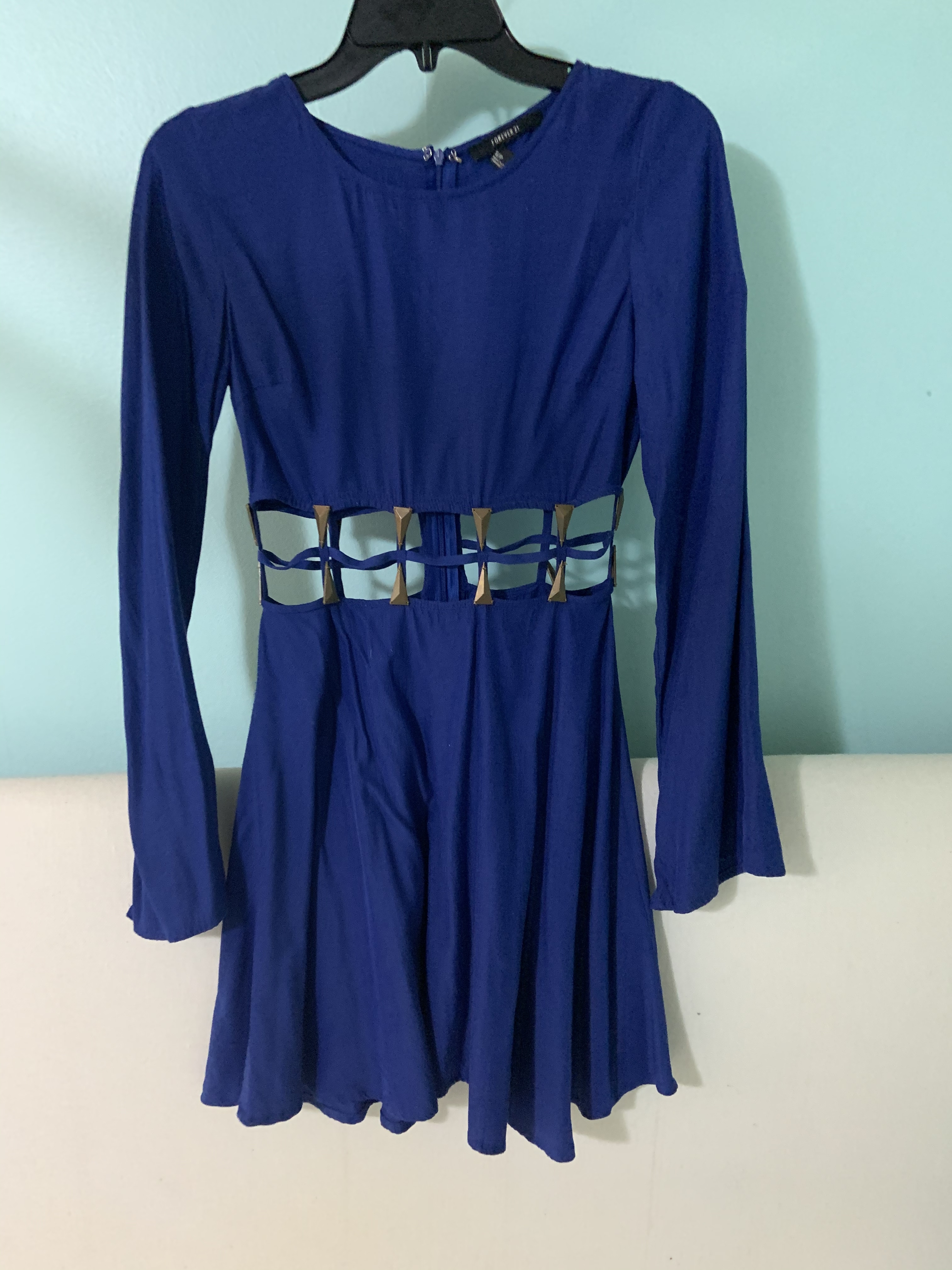 Short bright blue dress with a little stomach showing but mostly covered with gold triangles and blue cloth.