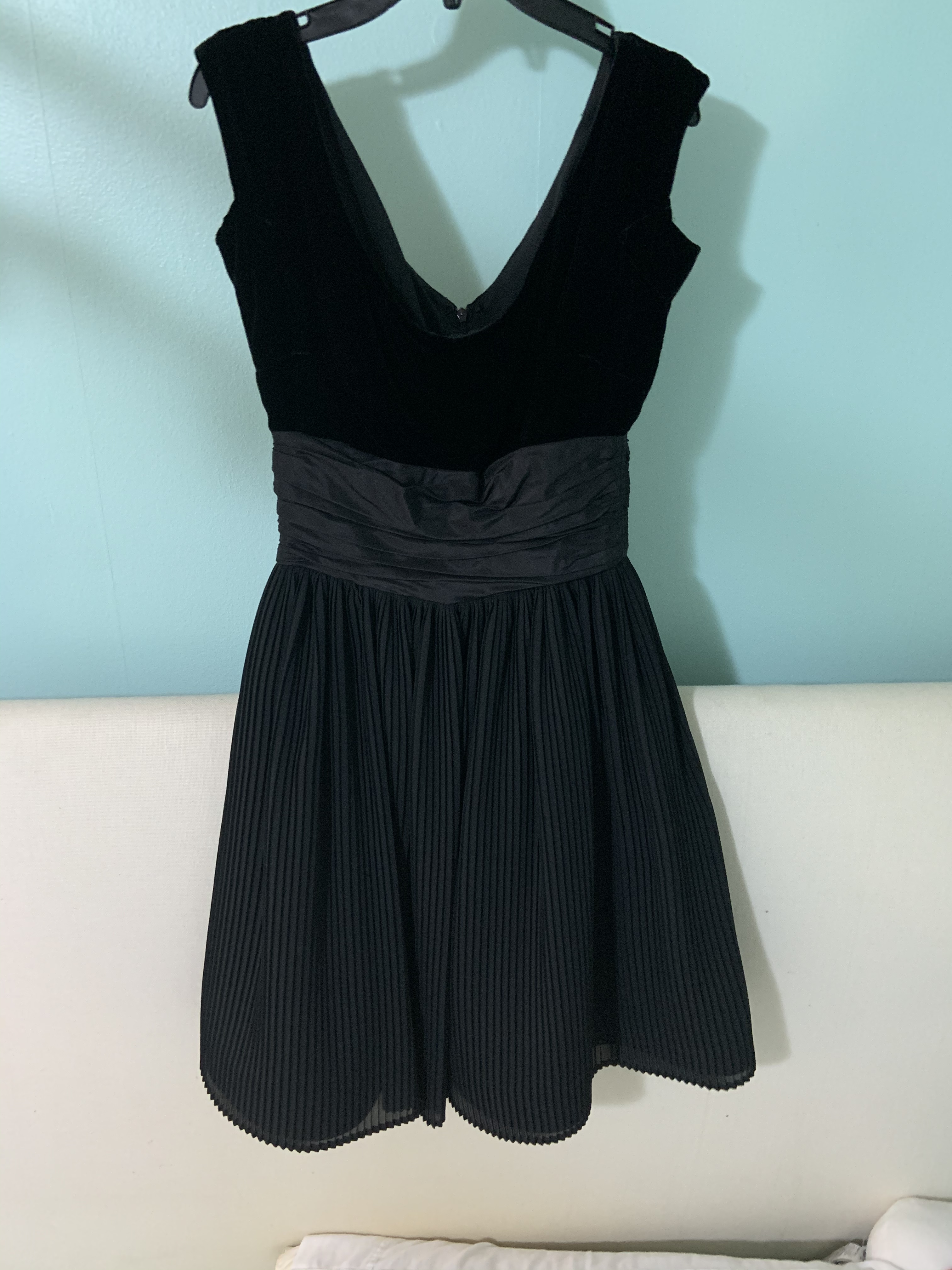 Velvet scoop top part (not a low scoop). Pleated skirt with attached sash. Zipper in the back. Looks wider in the photo than real life.