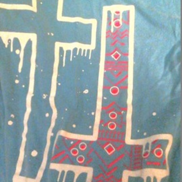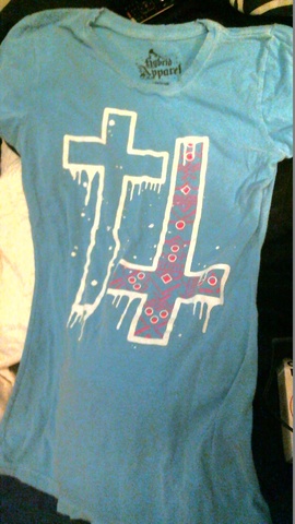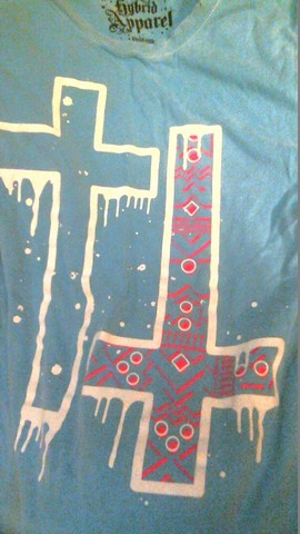 Haven't worn this much, light blue really is not my color ;) Super cute decorative crosses print. distressed around the collar seam (it is supposed to be like that) it is just too big for me
