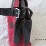 This purse is so cute.Perfect for horse lovers. It is Pleather and a needle point like fabric on it. No dings or damage. Lots of pockets for organization.