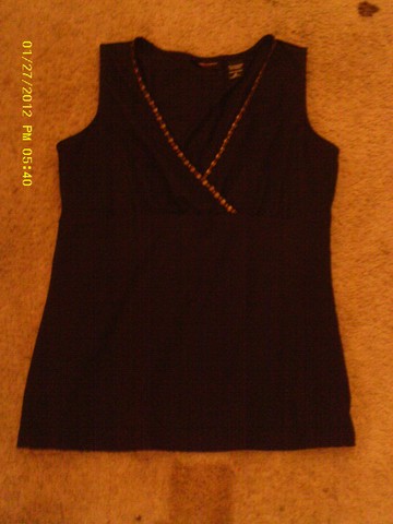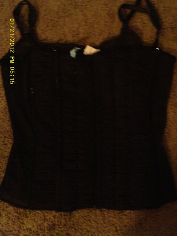 This is super cute with lots of intricate black beading. There is one line where toward the end, the beading is gone, but it is not really noticeable, and I only realized it when I was handling the top to Re-hash. Straps are adjustable, and it hooks all the way down like a corset. Size medium. Brand is Marciano, which is the high-end version from Guess.