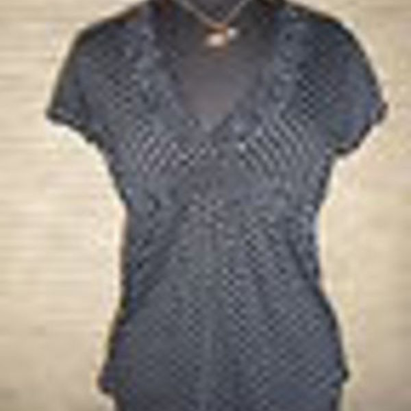 Size large juniors top, black and white polka dot print. Because it is a juniors, it does not really fit a size large, better fits a woman's size small/medium. Brand is Julie's Closet. 50% rayon, 50% polyester. When laid flat, the top measures approximately 23 inches from top to bottom and 15 inches across.