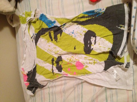 This is definitely a worn piece. It has lots of life to it, but there is slight cracking in some of the letters. It's a light, almost jersey material