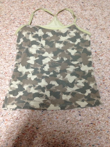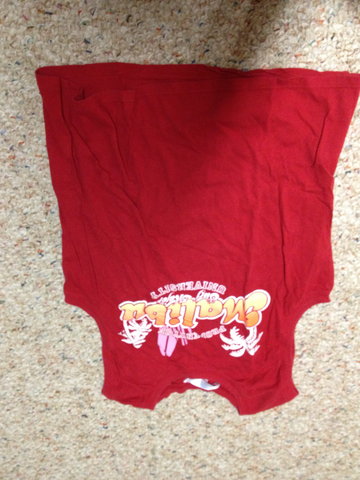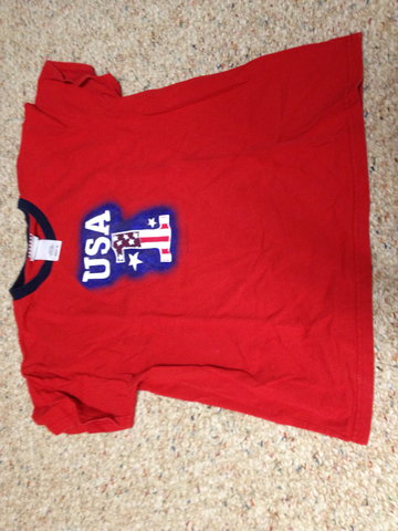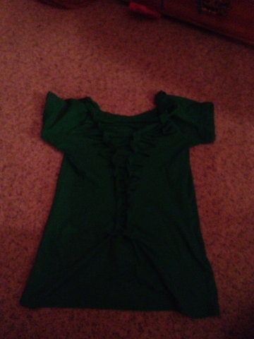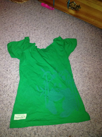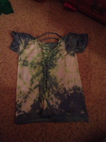 I had a phase in which I took t-shirts and created cool backs on them. This is one of my creations. I believe it's a childrens large, but it essentially is a womens small