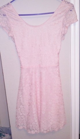 Its a pink lace dress, and it has an opening back to it, kinda forms and ''x''.