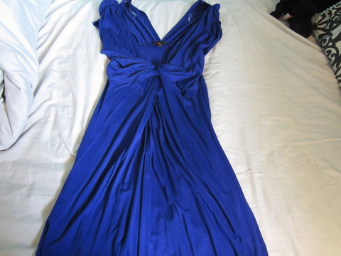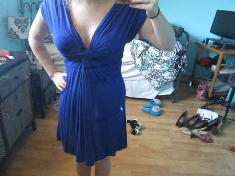 bright blue dress from forever 21. deep cut but you can just wear a cami under it. size small but would fit a medium also.