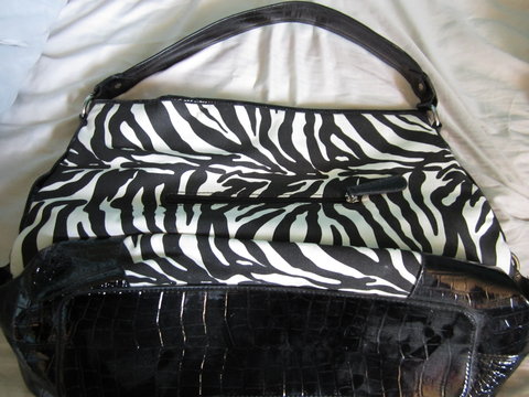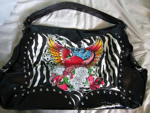 cute bag. brand new. quite big in size. zebra pattern on the back the inside is red. will hold everything you will ever need. good qaulity. looks sort of like ed hardy