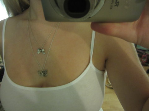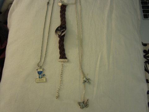 2 necklaces and a peace sign bracelet. first necklace says "i dont bite" second is one long necklace and one short combined.