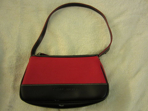 red and black tommy hilfiger purse. has a small mark on the bottom.
