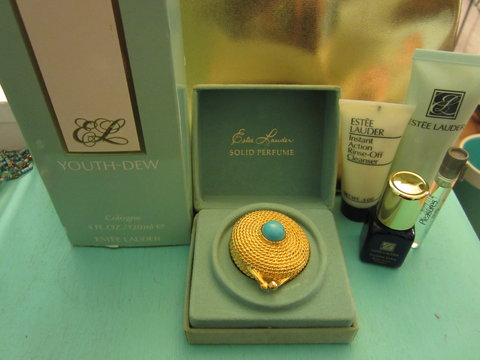 estee lauder youth-dew cologne, solid perfume, rinse of cleanser, body lotion, perfume sample, and eye serum.