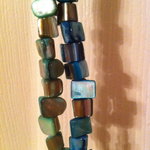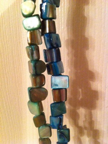 I paid about $20 for these as a set from Old Navy. The beads look like they're made from the inside of a shell. They feel like real, natural material, not plastic. These look great layered with a simple dress or top.