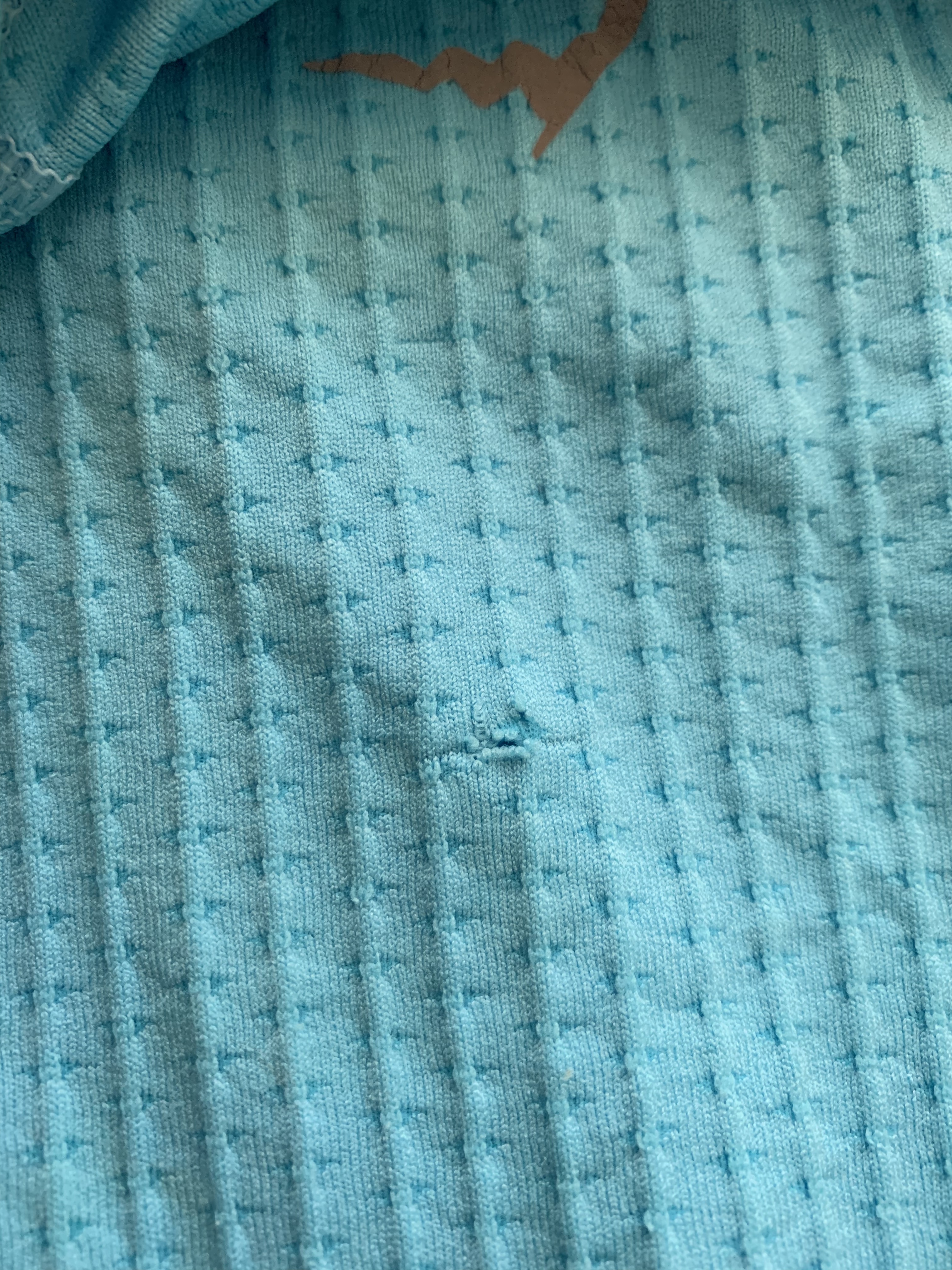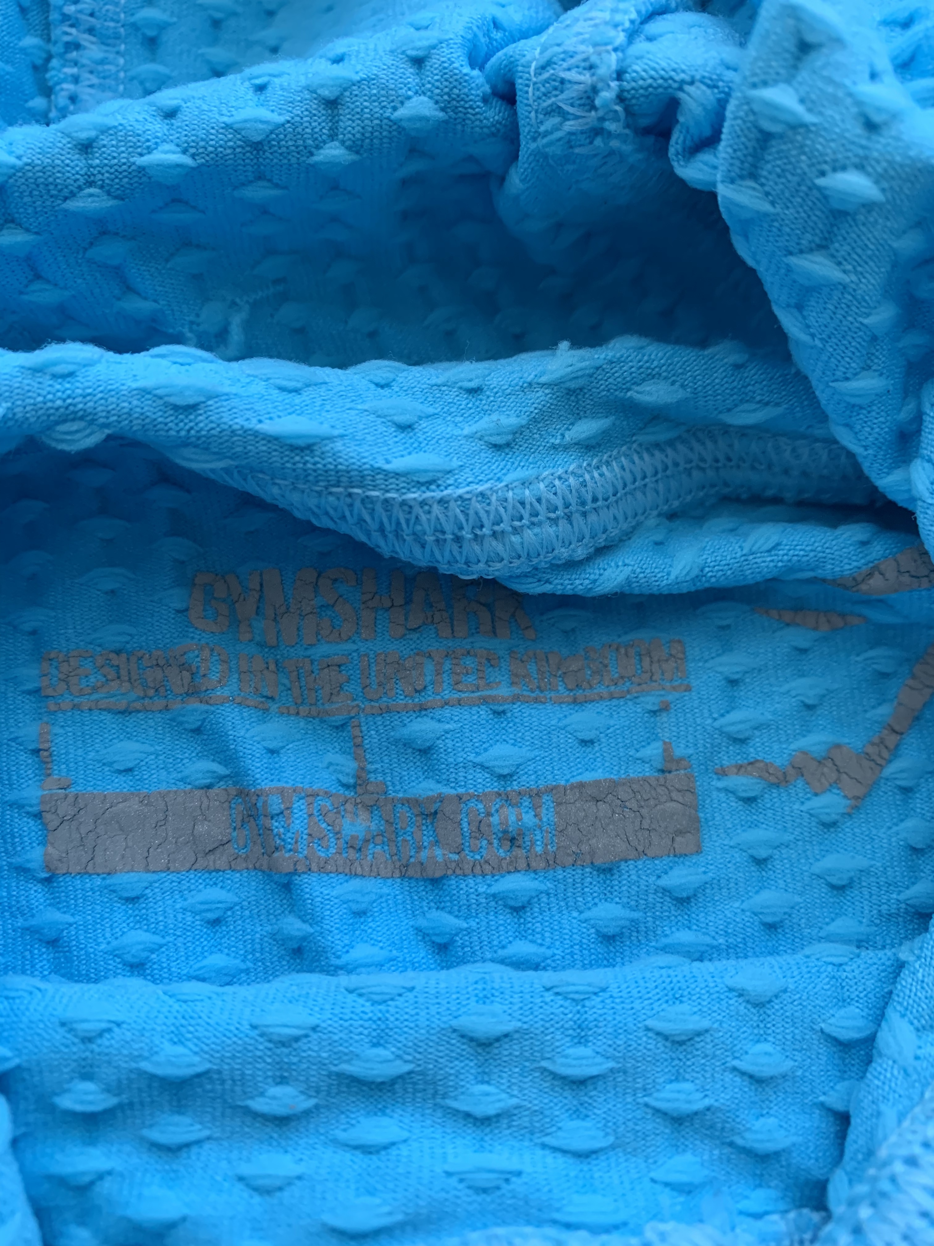 Size l but fits a m Color bright blue turquoise Gymshark brand Tiny little hole that can be sewn and not noticeable, see last picture.