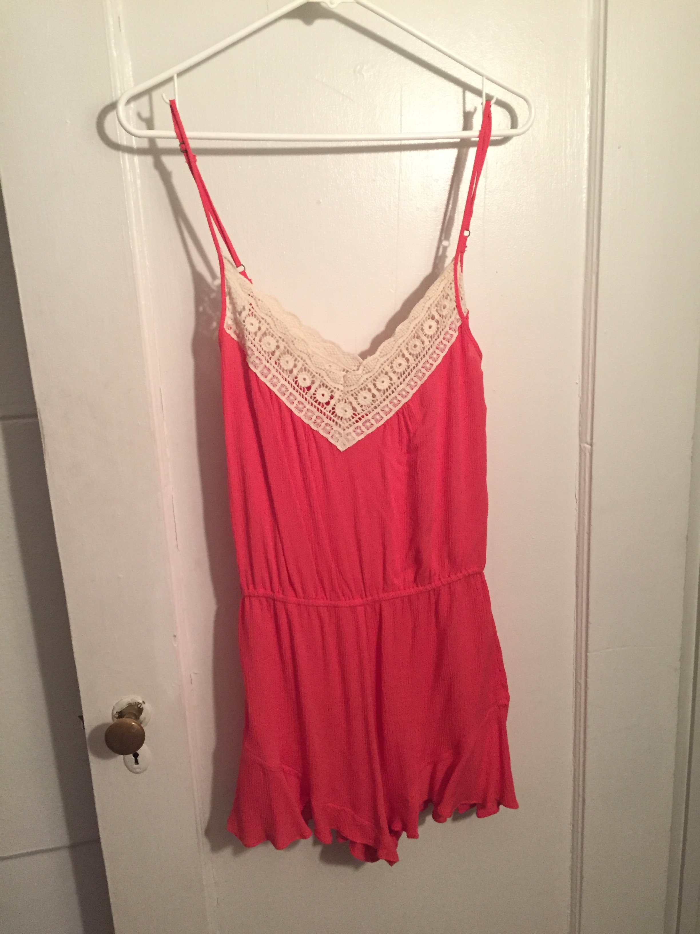 This is an orange romper with cream colored lace. Never been worn. It is too short for me. Size med