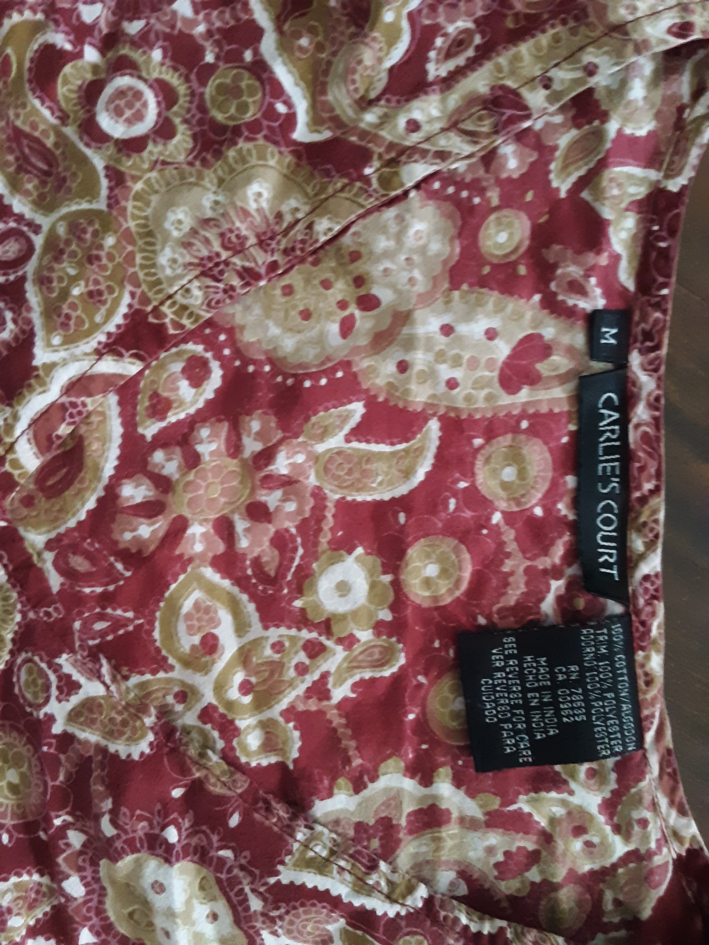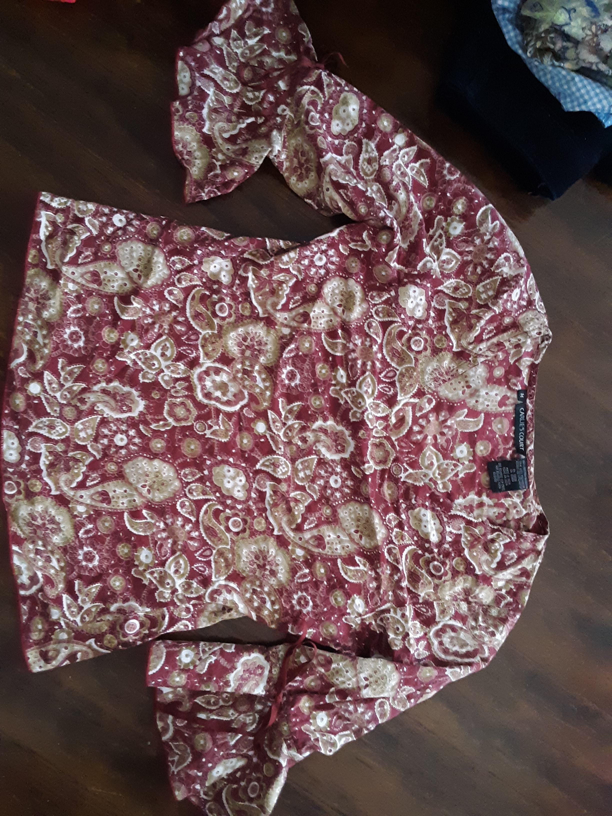 Half sleeve, paisley/floral top, V-neck. Sleeves bell out at elbow with strings to tighten above the bell