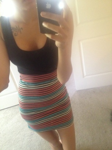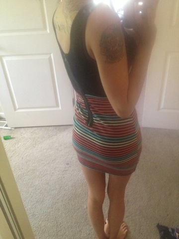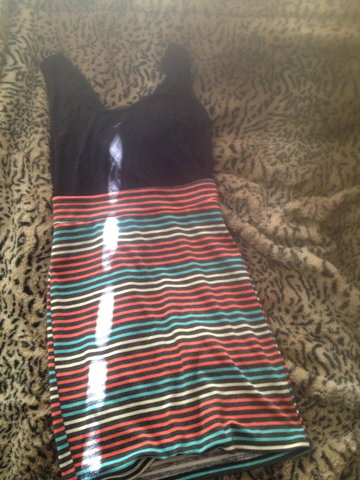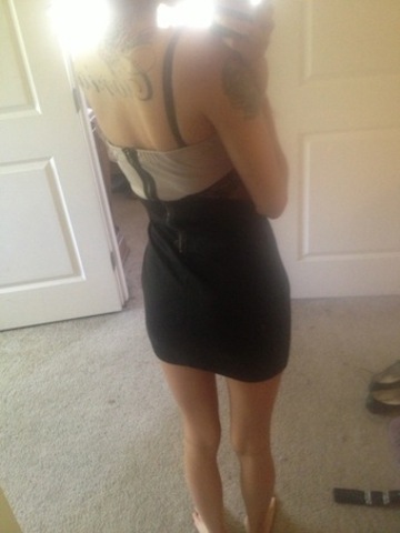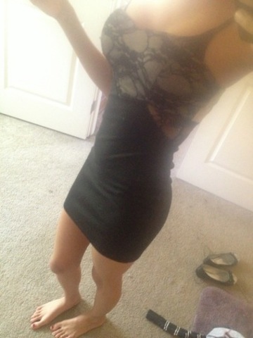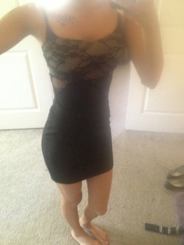 My favorite dress, I just never really wear dresses. The bus is black lace over tan, and each side under the bust has a diamond shaped cutout where it is just black lace, then it comes out into the rest of the full black dress. Comfy elegance:) It can be used to dress up or even worn with cute sandals for just a day out.