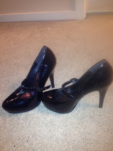 Strap over the top. Suuuper tall! Really sexy heels. Worn once but have been floating around in my closet for a while. By 'Joeys'.
