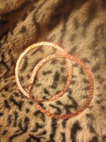 Like a dark gold- really cute! Skin tone flattering. Large hoops. I have plugs in my ears [3/4] and I wear these in my second holes, but it looks kind of weird but I really love these so I might not want to give them up. The design on them looks like foil with little crumples, hard to explain!