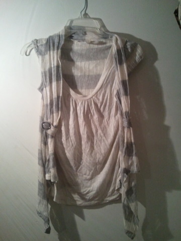 Off white and grey striped blouse worn a few times..has a fur-like fabric around neckline size small but can fit a medium
