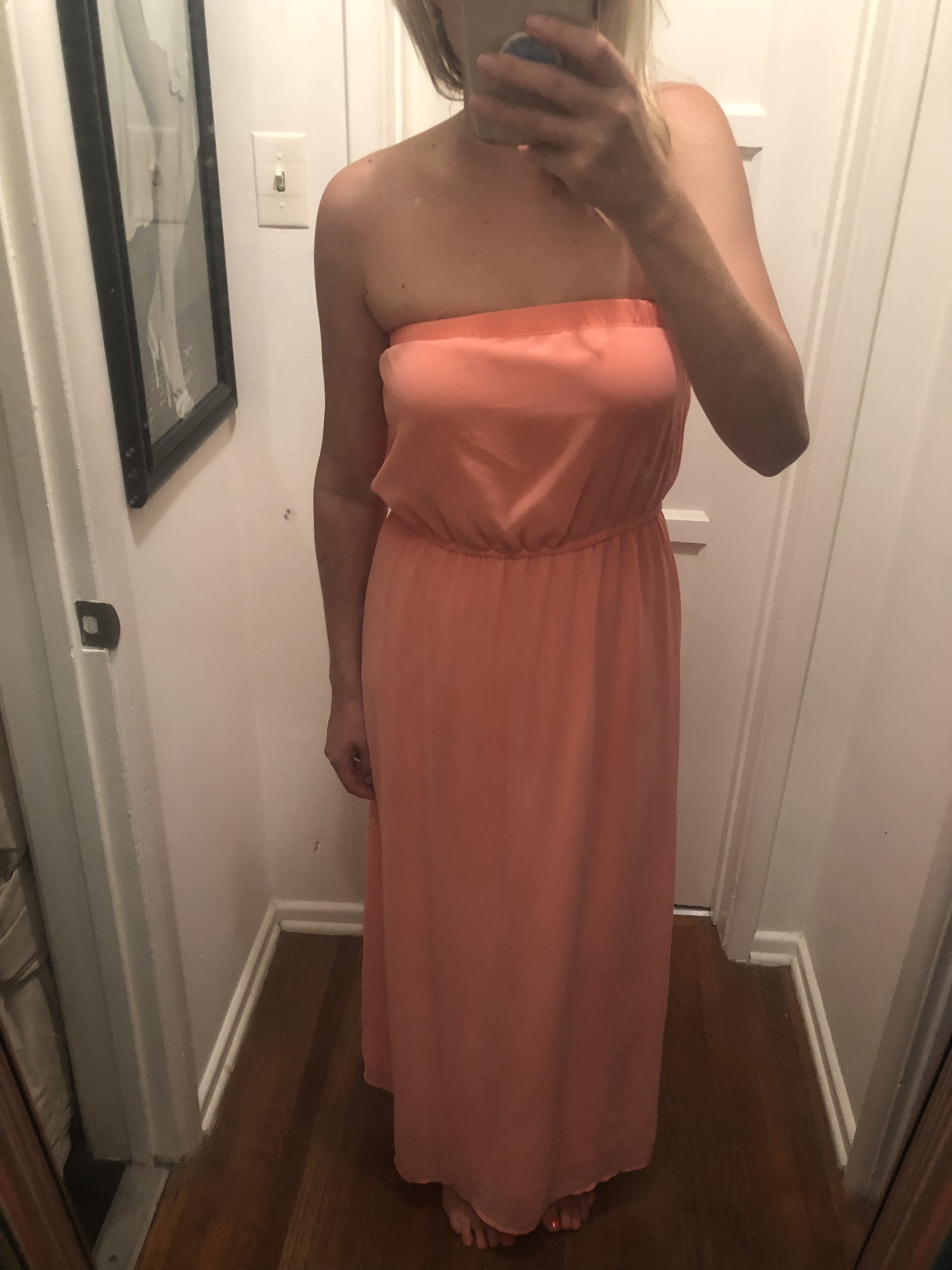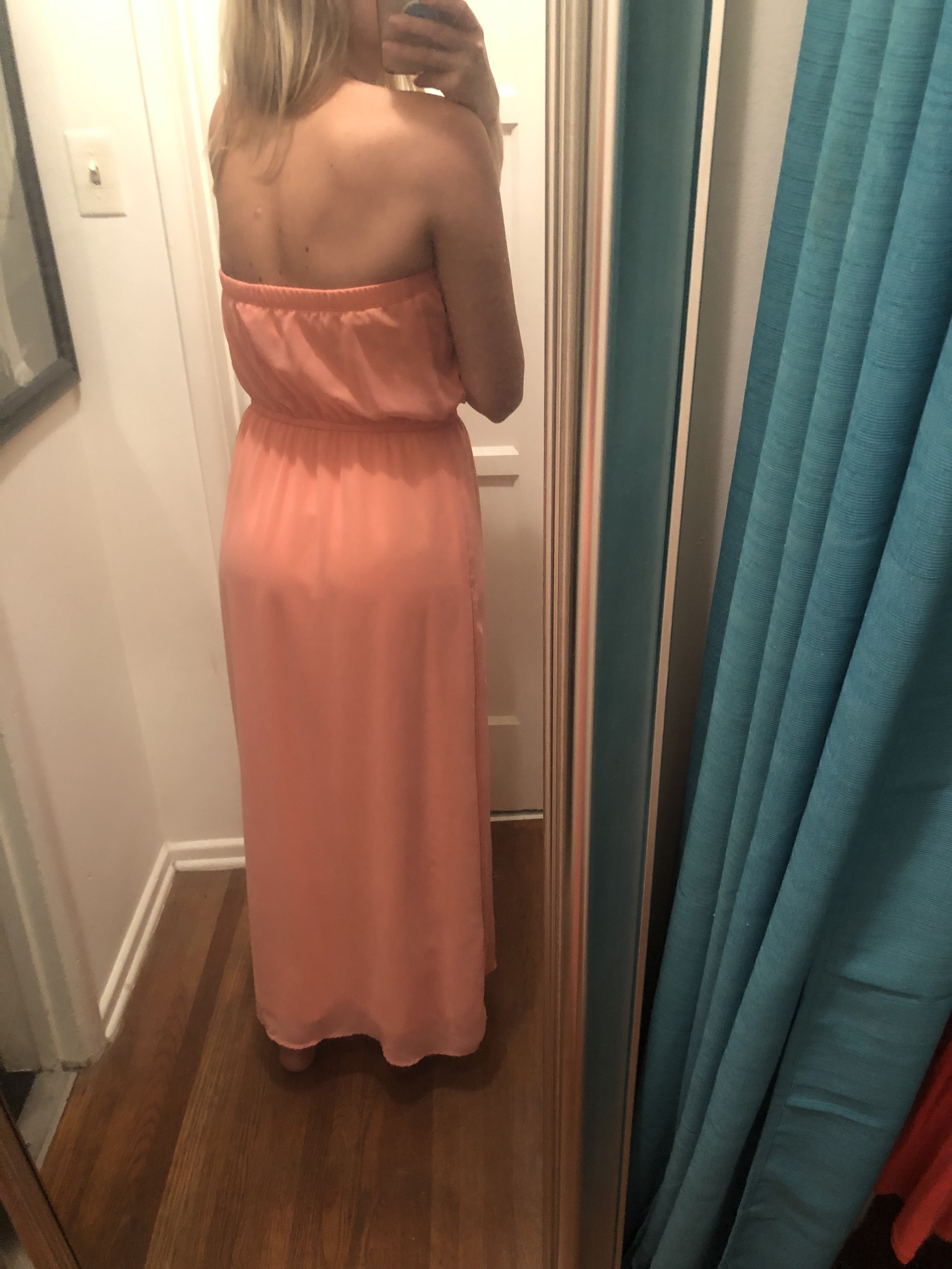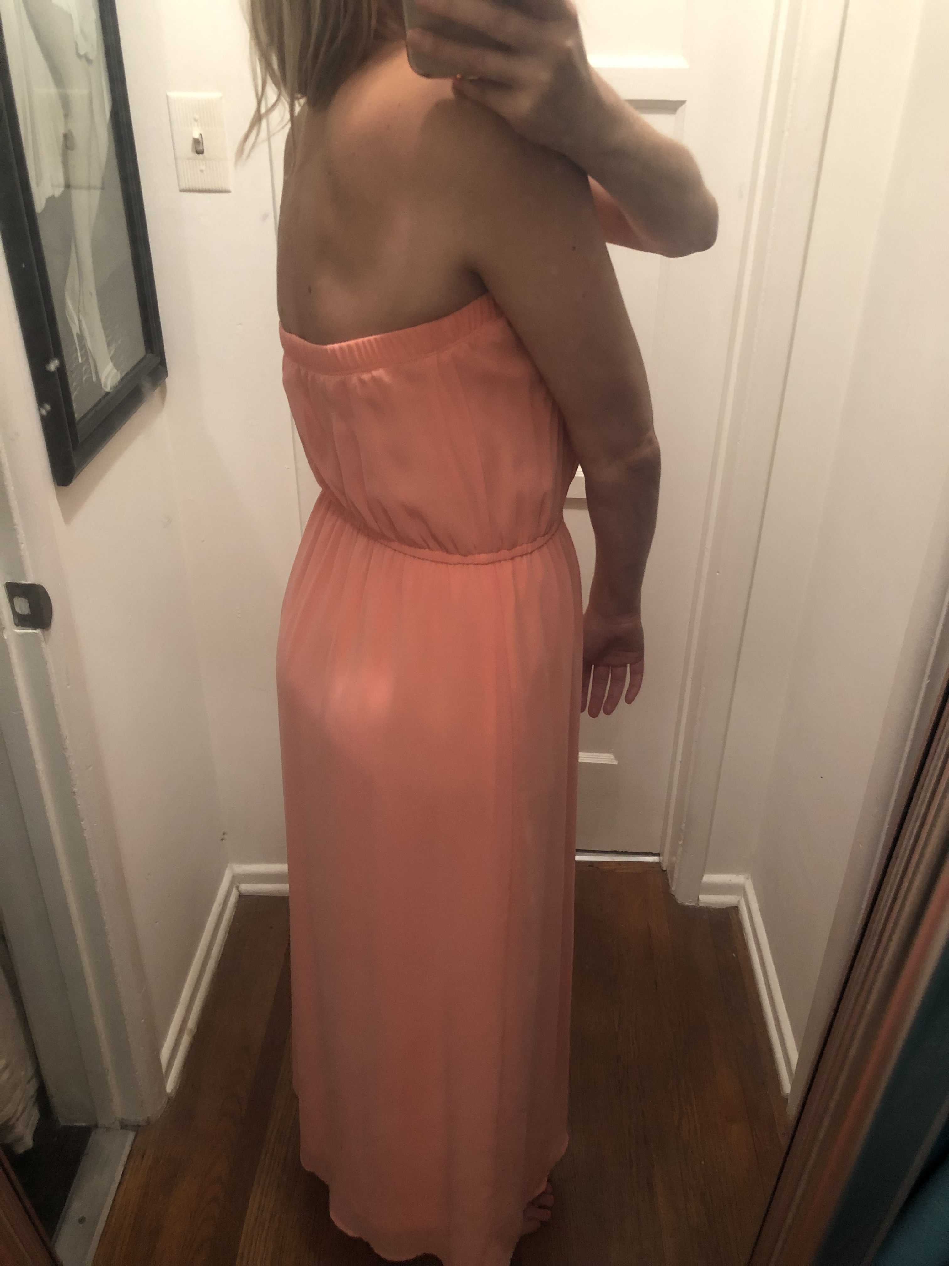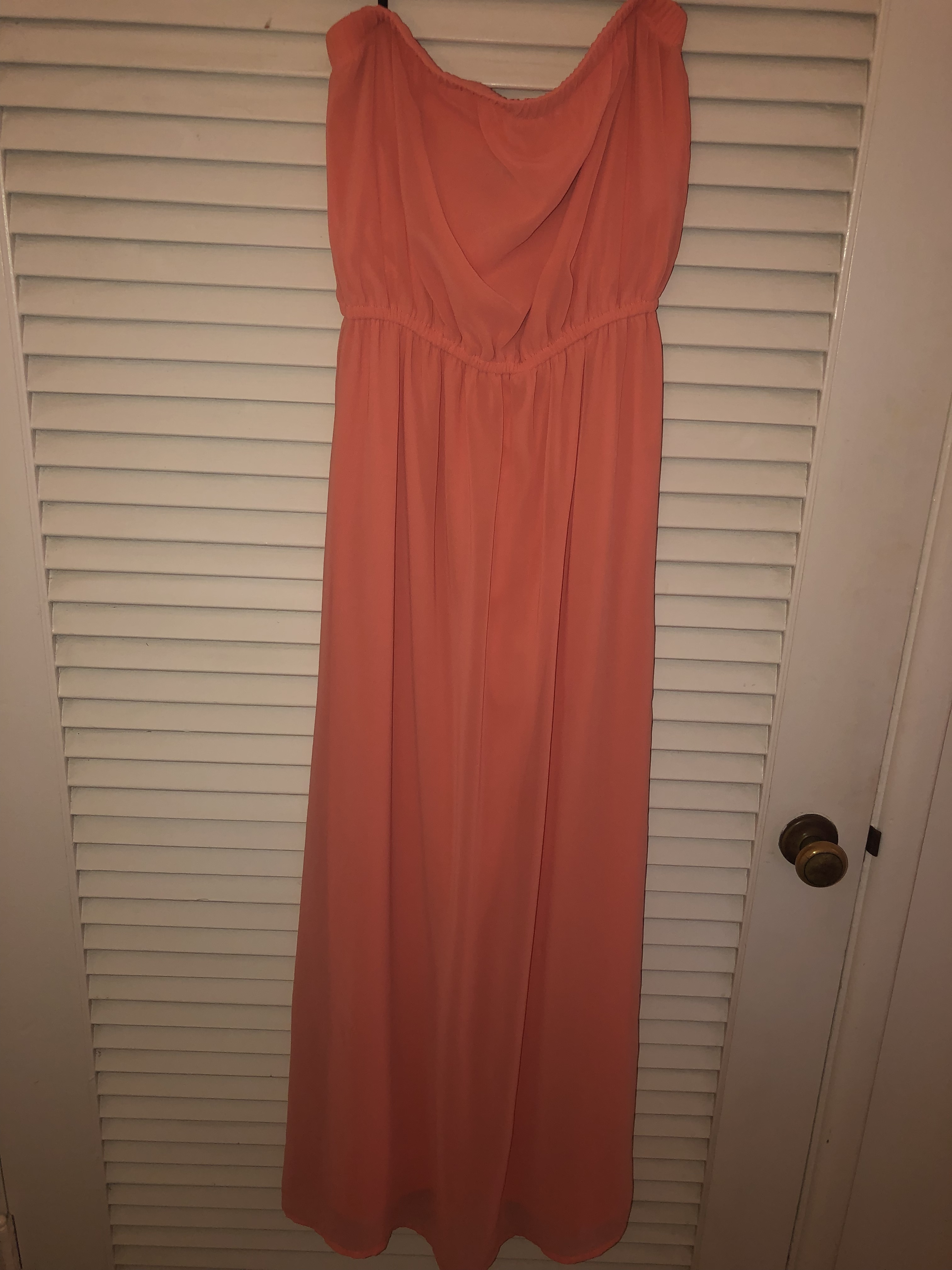 Peach/ Salmon colored, Tube Top styled maxi dress made with polyester material from Forever 21. Only worn a few times. Great for a Summer wedding, bridal shower, baby shower... or just a nice brunch!