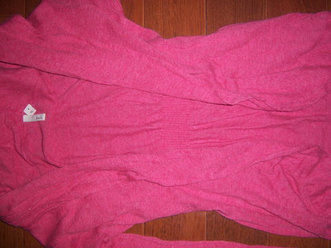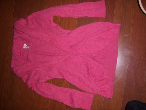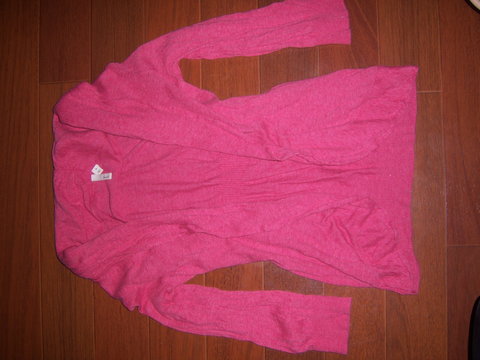 here's a small sweater with open front style. very soft and a thinner soft sweater fabric. overall Meh to good condition. (color in photo looks hot pink but actual color is dull pink color)