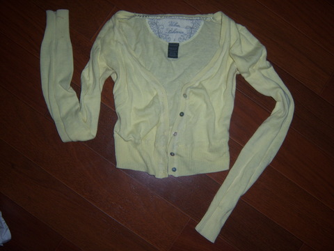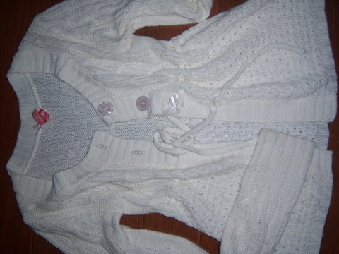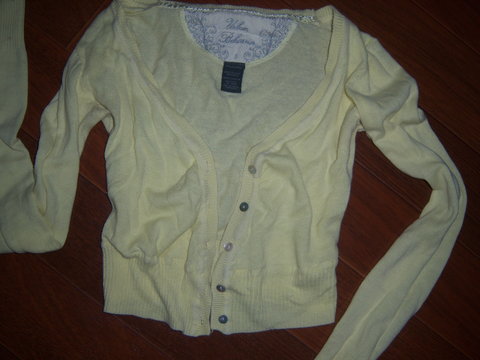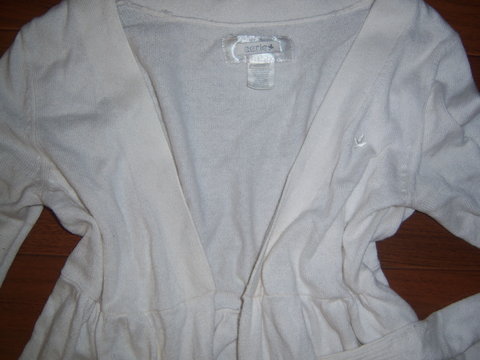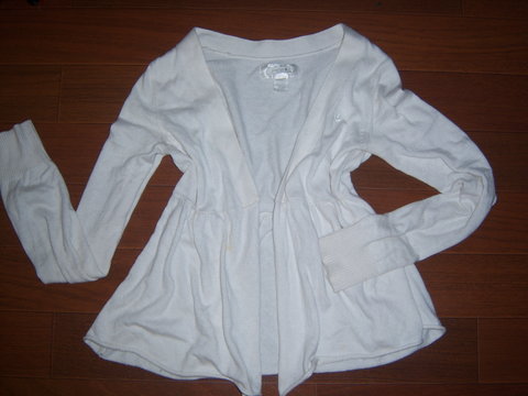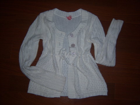 Here's a size SMALL sweater in cream-white color. Flare bottom with strings to tie together on bust. Overall, great condition. I worn this maybe 3 times.
