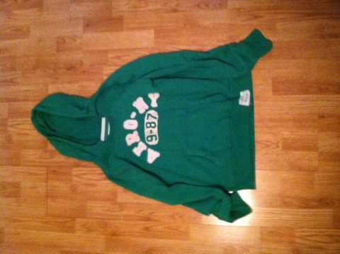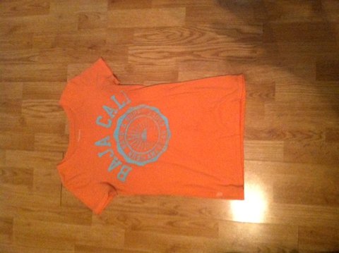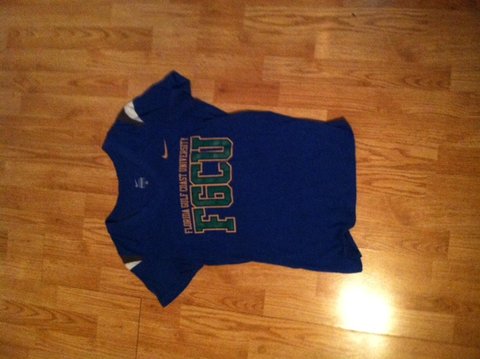 Multi-colored lettering on chest. V-neck cut. Very flattering shirt. Thinning and makes your boobs look huge.