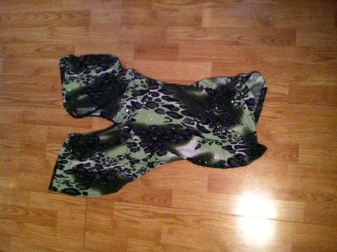 Never worn. Comes with thin cheeta waist belt. The front ties like a scarf. To be worn with a tank under it. Loose flowing short sleeves
