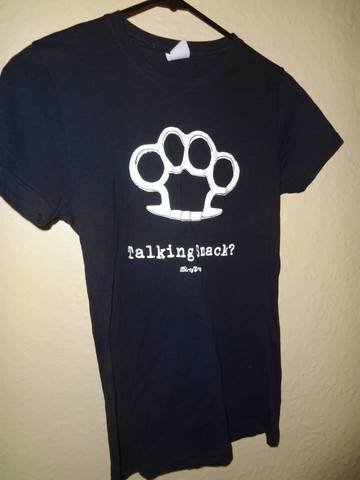 like new, size small, graphic shirt with brass knuckles and "talking smack?" underneath