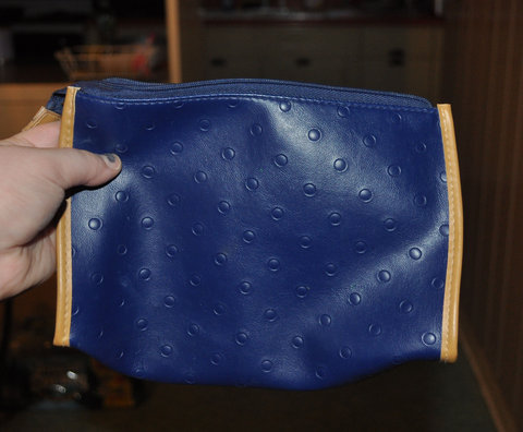 This is fairly new only used it for a few peices of makeup a few times. Its blue and a good size
