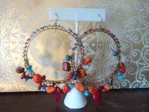 I Made these beauties. They are large and funky and perfect for this spring or summer. Multi colored stones in orangrs and reds and turquoise. Also crystals as well to give it a subtle sparkle.