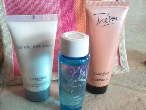 Tresor lotion 2.0 fl oz. La vie est belle lotion 1.7 fl oz eye make up remover. 1.7 fl oz. Cute bad included as gift to you!