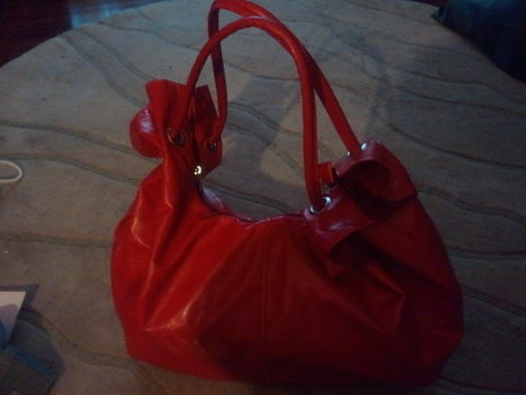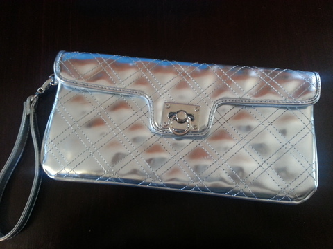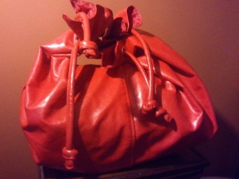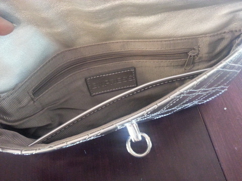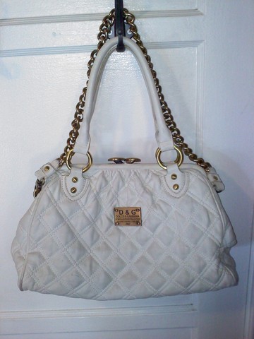 Color: White. Design: vintage 50's quilted design. Measures: 15X9 Handles: 8 inches high. ~there is a zipper in the back. ~has gold-bronze embellishments including the chain. ~chain can be taken off and can be carried as a purse. ~the inside has a zipper closure and two small pockets. It's in good condition because it has a stain from the metal chain but it's hidden and not noticeable and some wear at the top. Other than that it's great.