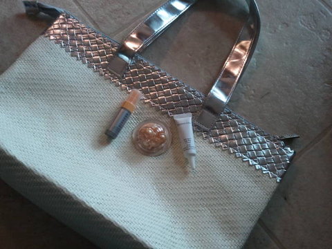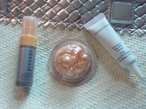 Advanced lip fix cream .17 oz Gold ultra resorative capsules .11 fl oz. Approx. 7 capsules Prevage anti aging cream with spf 30 cute cream bag with Silver design trim..cute for the beach or summer handbag!