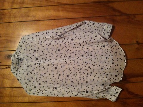 New York and Company, 3/4 length sleeves and gathers at waist. Never worn very much, but it is a very pretty shirt!