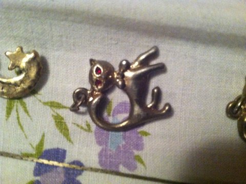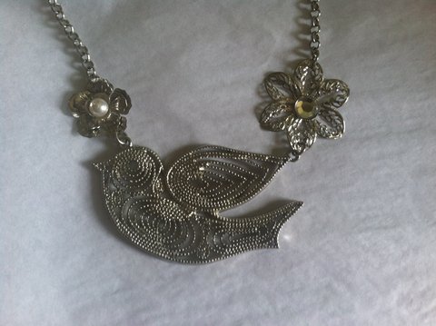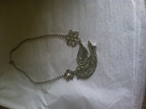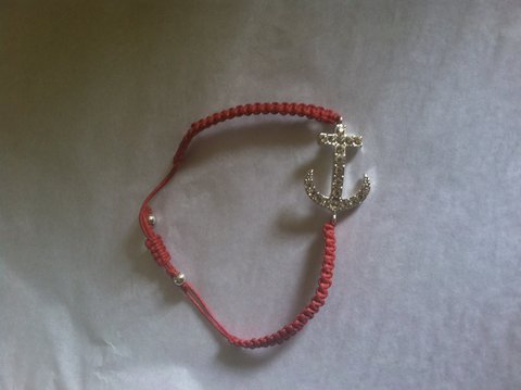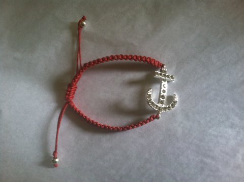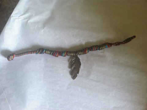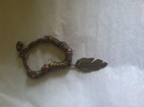 Worn only a few times. Red, purple, green, blue, and brown thread with bronze rings and feather
