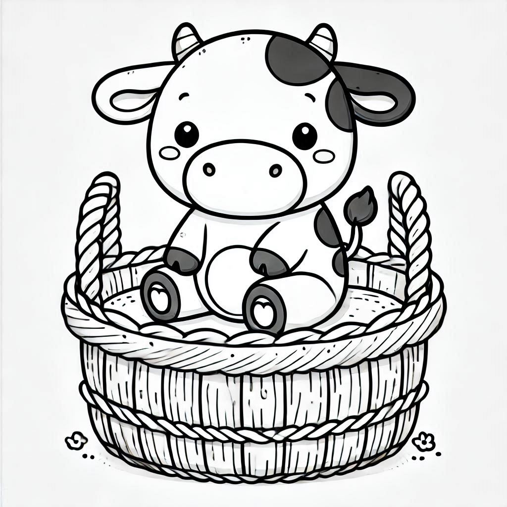Cow Coloring Page – Baby Cow Sitting in a Cozy Basket