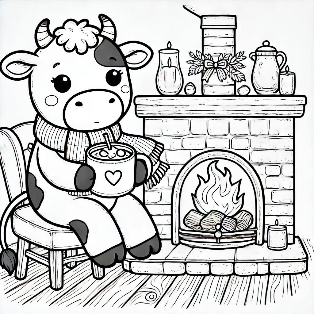 Cow Coloring Page – Warm and Cozy Cow Sitting by the Fireplace