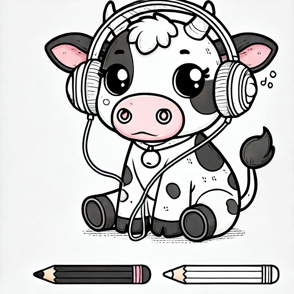 Cow Coloring Page – Cute Cow Wearing Headphones and Listening to Music