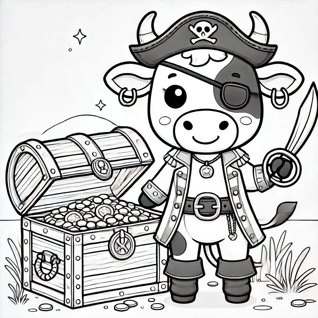 Cow Coloring Page – Pirate Cow with Treasure Chest of Gold