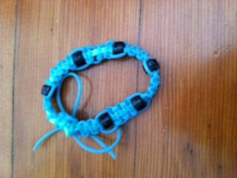 handmade. it's made out of scooby thread so it's stretchy and plasticy. with black pony beads.