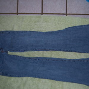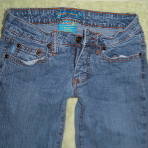 Here's a size 1 denim jean made by: FANG. Have slightly rugged wrinkle look to it, made to look like its been worn alot. Zip-fly, pockets front and pockets on back. Flare legs, and slightly stretchable to give a little stretch to fit your shape, but not too stretchy either. Size says: 1/2. (This jean fits like a MUDD or L.E.I. size 1/2). Inseams is regular lenght around 32" to 33" inches inseam. I worn this about 3 times. Very flare legs, and in good condition still.